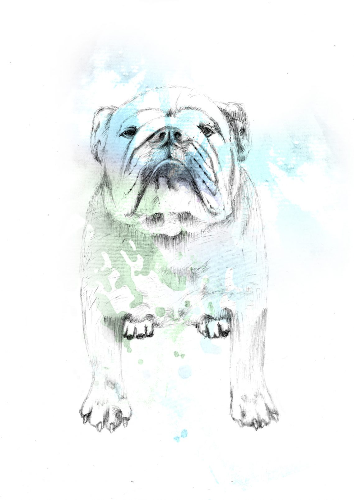 Pet portrait of Del Boy the Bulldog, pencil and digital.
